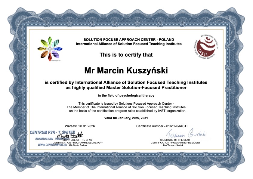 • Ukończył ścieżkę kształcenia w nurcie Terapii Skoncentrowanej na Rozwiązaniach oraz zdobył certyfikat terapeuty Polskiego Stowarzyszenia Terapeutów Terapii Skoncentrowanej na Rozwiązaniach (PSTTSR) oraz Master Solution Focused Practitioner IASTI. Aktualnie kontynuuje proces kształcenia w kierunku uzyskania certyfikatu psychoterapeuty Polskiego Stowarzyszenia Terapeutów Terapii Skoncentrowanej na Rozwiązaniach (PSTTSR).